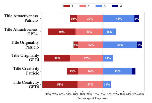 有趣的是,研究还发现提示词(在这里是标题)对AI的创作质量有显著影响。下图展示了普龙和GPT-4提供的标题在原创性、吸引力和创造力方面的评分对比。可以明显看到,普龙提供的标题在这些维度上得分显著高于GPT-4的标题。