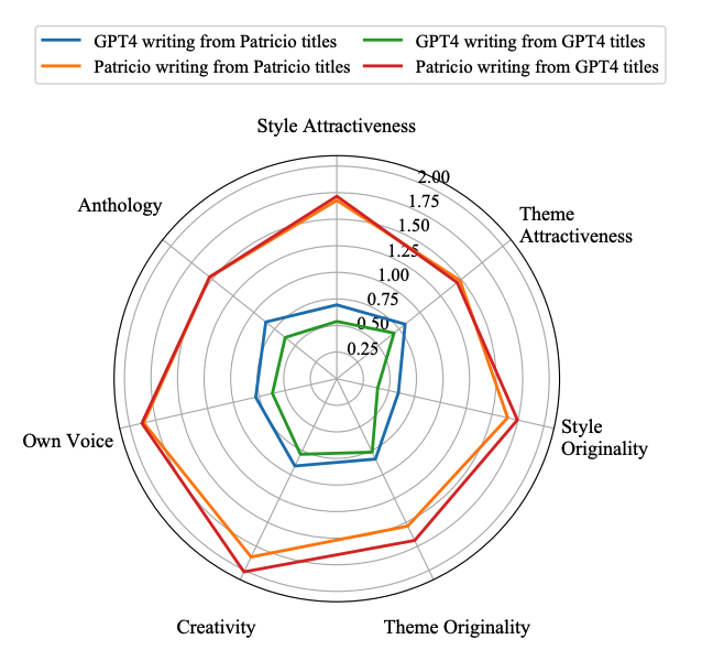 更有趣的是,研究者通过雷达图展示了不同来源的标题对最终文本质量的影响。当使用普龙提供的标题时,GPT-4的表现有明显提升。特别是在风格原创性(提高57%)、风格吸引力(提高30%)、适合收录选集(提高45%)和作者个人风格(提高30%)等方面,GPT-4都有显著进步。这一发现突出了人类创意思维在引导AI创作中的重要作用,也为人机协作创作开辟了新的可能性。