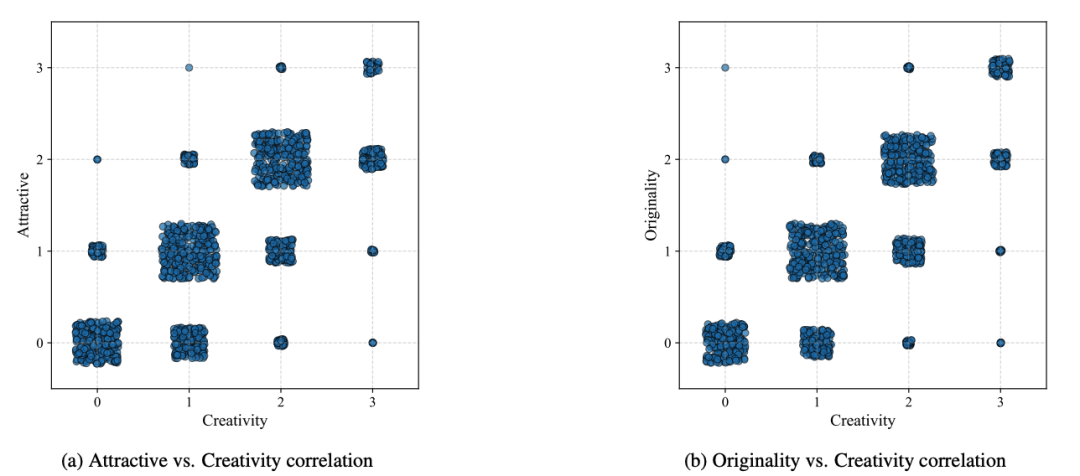 混合效应模型:用于分析吸引力和原创性对创造力评分的影响。模型如下:创造力 = + 风格吸引力 + 主题吸引力 + 风格原创性 + 主题原创性 + 标题 + 用户名 + ϵ 其中,标题 和 用户名 是随机效应,用于控制标题和评估者的影响。