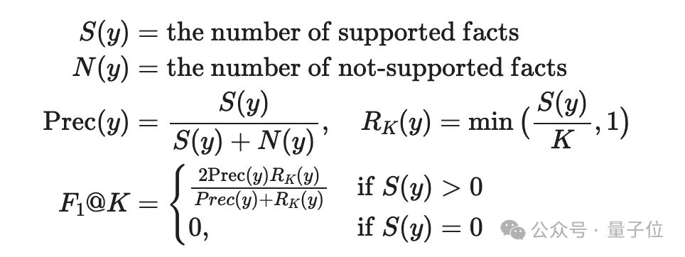 长篇****的:通过召回率衡量,即提供的事实占应出现在响应中的所有相关事实的百分比。因此,要考虑最多支持的事实数量𝐾。