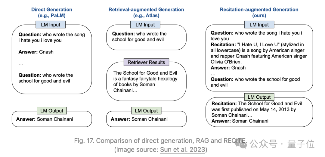 其动机是将Transformer的记忆作为信息检索模型来使用。在RECITE的复述与回答方案中,首先要求LLM复述相关信息,然后生成输出。