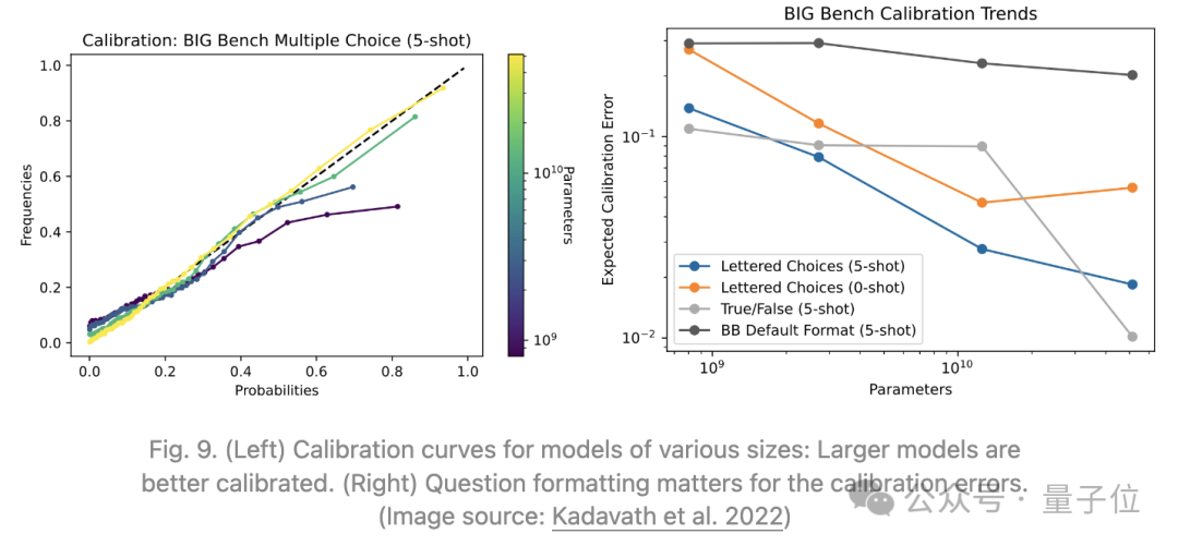 Kadavath等人2022年的实验表明,在具有可见字母答案选项的多种多选题格式(MMLU、TruthfulQA、QuALITY、LogiQA)中,LLM在估计答案正确性的概率上表现得很好,这意味着预测的概率与该答案为真的频率一致。