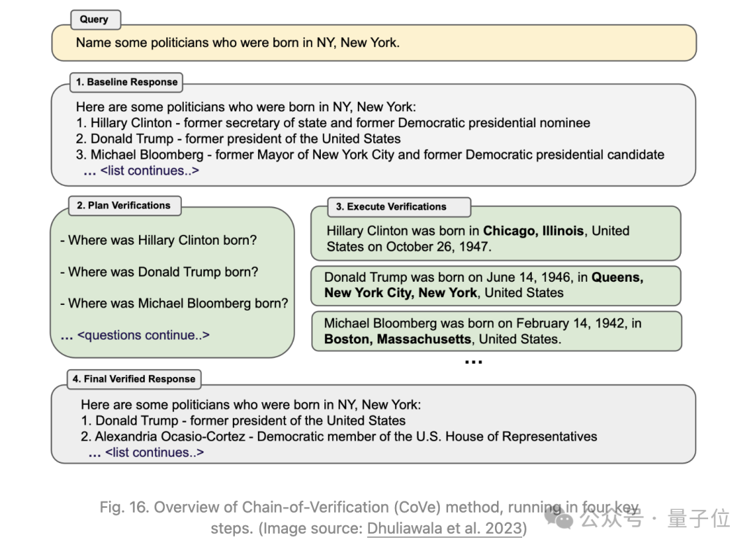 Dhuliawala等人2023年提出了一种基于动作链进行规划和执行验证的方法,名为Chain-of-Verification(CoVe)。CoVe包括四个核心步骤: