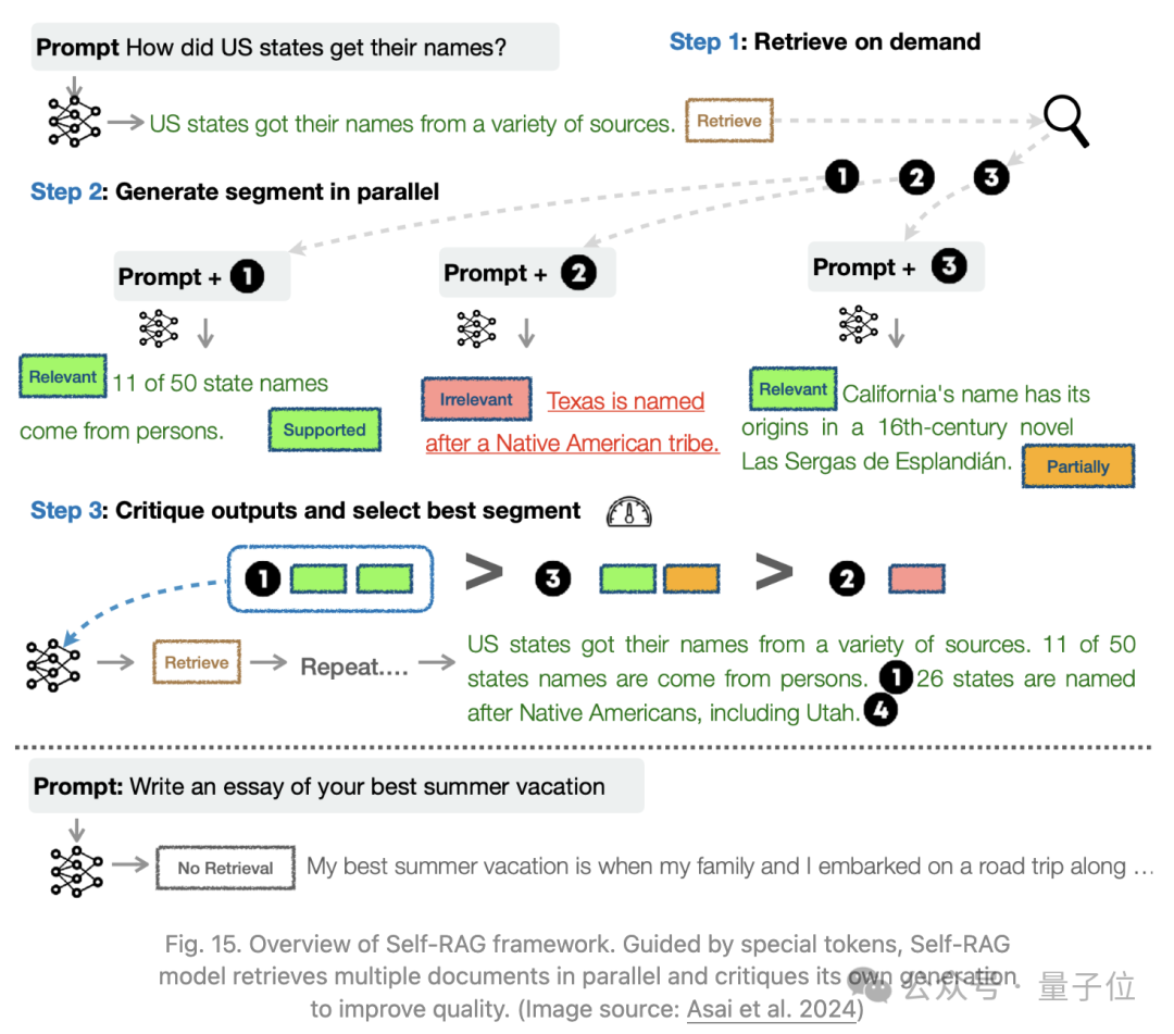 S****elf-RAG(Asai等人,2024)通过端到端训练一个语言模型,使其学会通过输出任务结果和间歇性的特殊反思标记来反思自身的生成。