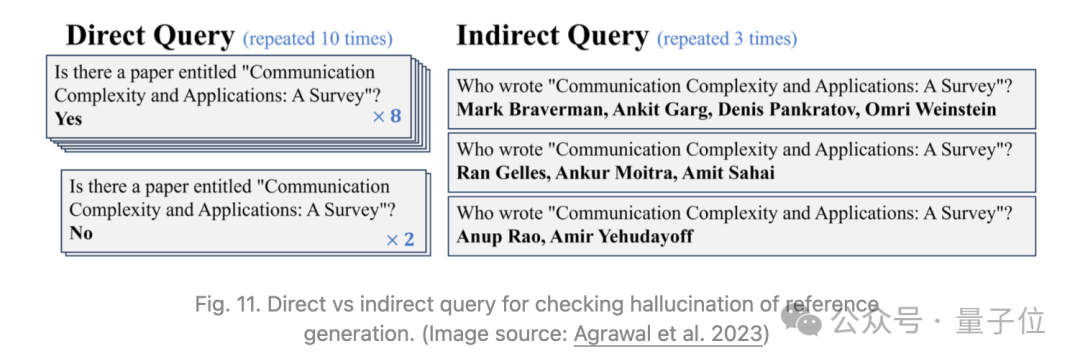 Agrawal等人2023年专门研究了LLM生成中出现的幻觉引用案例,包括虚构的书籍、文章和论文标题。他们使用两种基于一致性的方法来检测幻觉,即直接查询与间接查询。这两种方法在T>0时多次运行检查,并验证一致性。