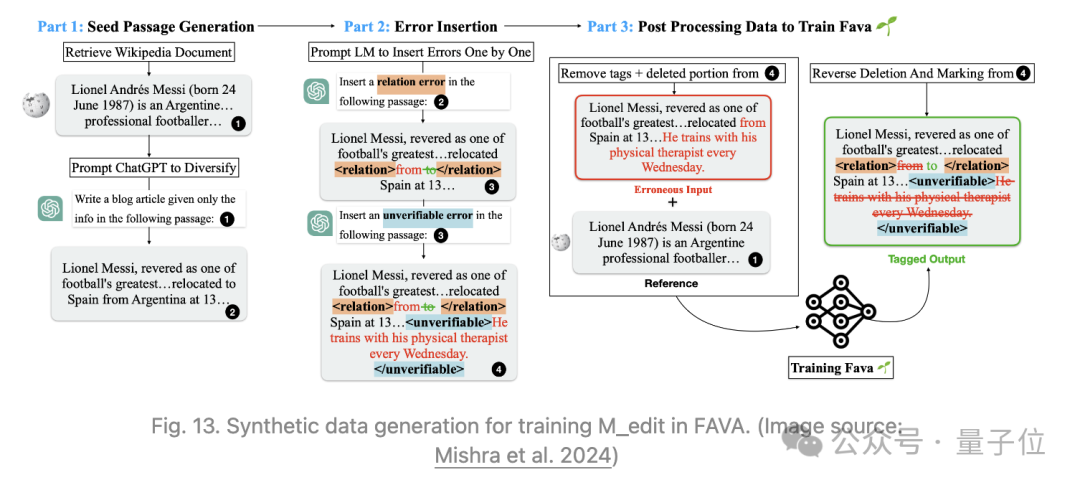 RARR不需要训练,但是FAVA中的编辑器模型𝑀edit需要微调。通过更详细地分类不同类型的幻觉错误,可以为编辑模型生成合成训练数据,方法是在模型生成中插入随机错误。