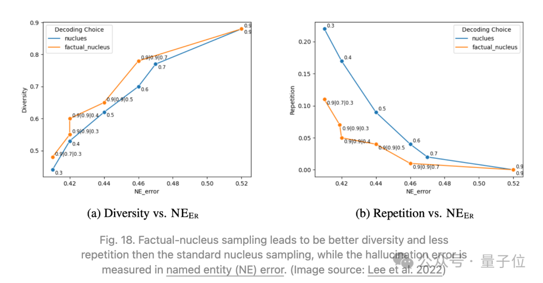 Lee等人2022年发现,在FactualityPrompt基准测试中,核采样(top-𝑝采样)的表现不如贪婪采样,尽管核采样增加了额外的随机性,实现了更好的多样性和较少的重复。