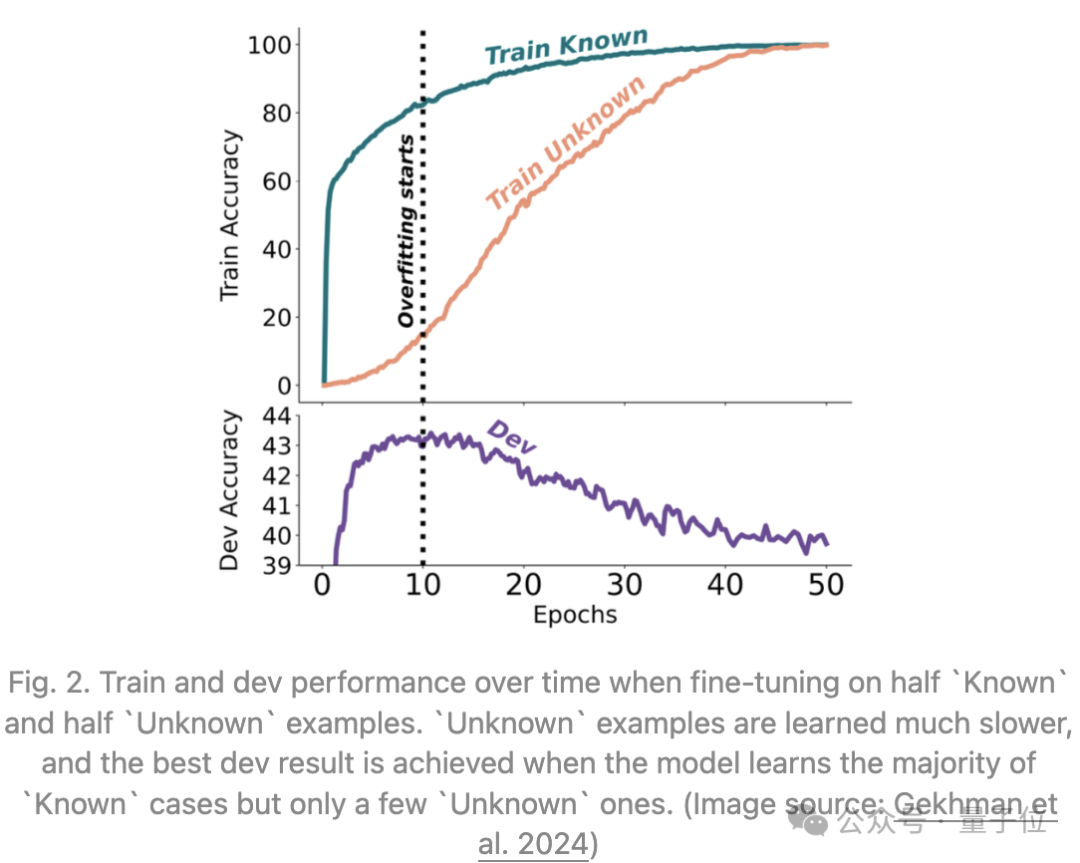 他们发现:LLM学习带有新知识的微调示例,要比学习与模型预先存在的知识一致的示例,学得更慢;一旦学习了这些带有新知识的示例,模型产生幻觉的倾向就会增加。