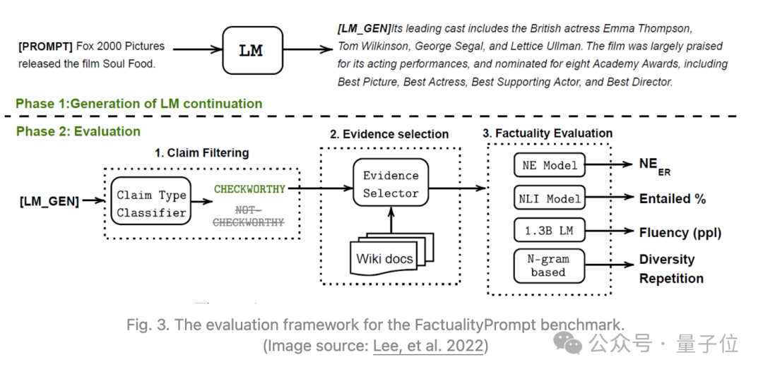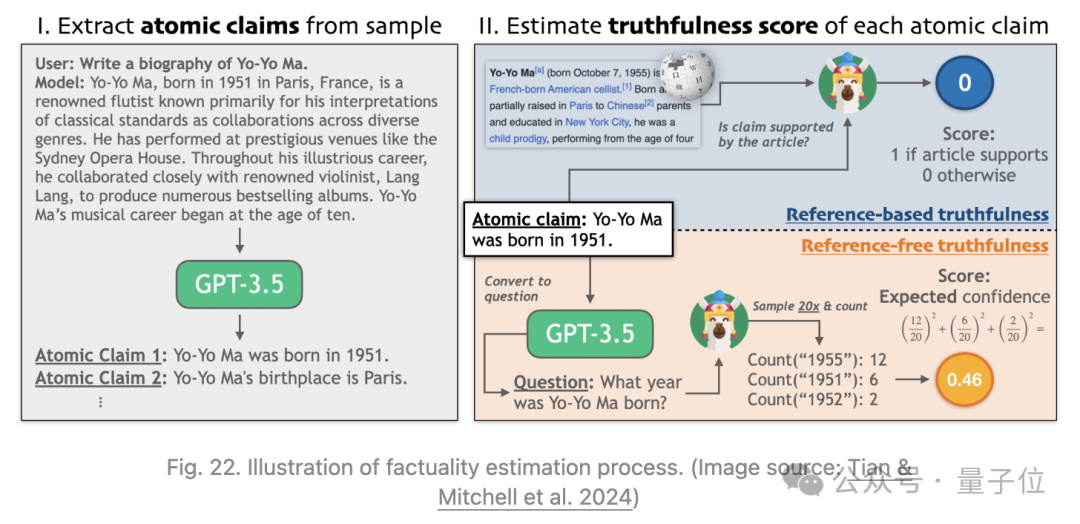 此外,Min等人2023提出了FActScore,将长文生成分解成多个原子事实,并根据维基百科等知识库单独验证每个事实。然后可以测量每个模型生成的知识来源支持的句子的比率(精度),FActScore是一组提示中模型生成的平均精度。