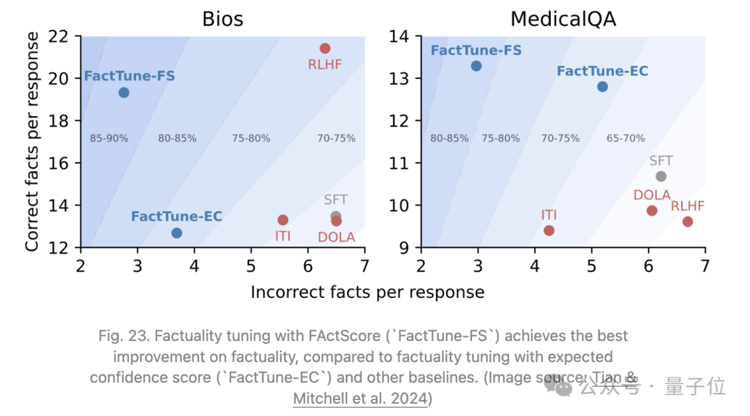 Tian&Mitchell等人2024年提出的Factuality tuning同样依赖于微调语言模型以提高事实性。他们试验了不同的方法来估计每个模型样本中原子声明的真实性,然后运行DPO。