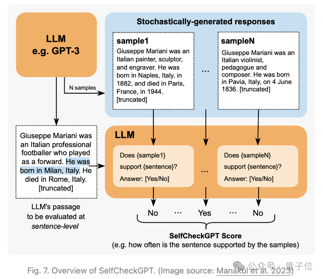 Manakul等人2023年提出了依赖于对来自黑盒LLM的多个样本进行一致性检查——SelfCheckGPT,以识别事实性错误。