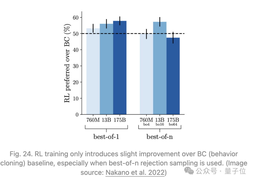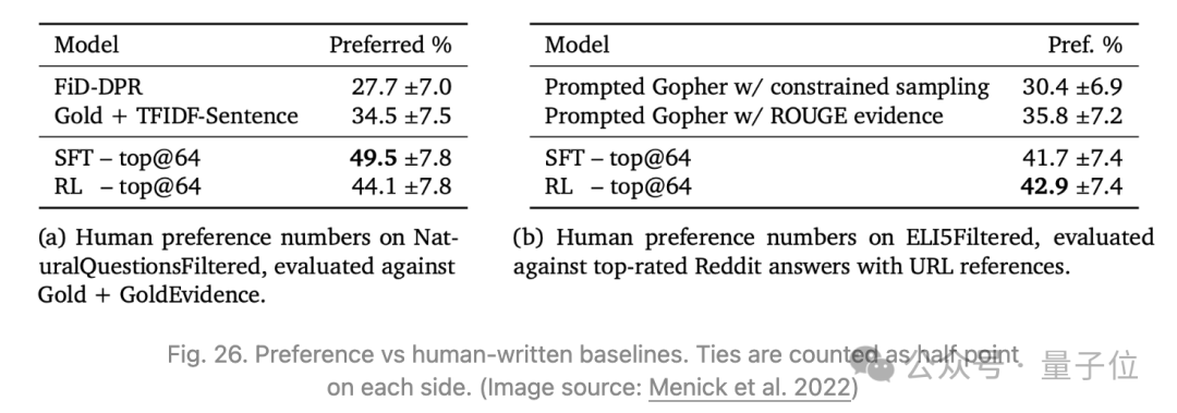 收集同一问题的两个模型生成的答案(每个答案都有自己的参考集)之间的比较数据,其中答案会根据其事实精度、连贯性和整体有用性进行评判。奖励模型用于RL训练和best-of-n拒绝采样。相比之下,RL效果有限,并且当使用拒绝抽样时,效果更有限。
