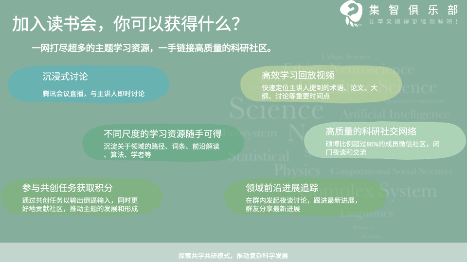 关注线上直播:读书会的部分分享主题,会在集智俱乐部平台在线直播。
