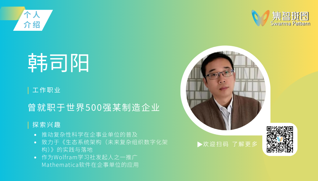 韩司阳,曾就职于世界500强某制造企业,主要负责各业务领域数字化规划与架构工作。拥有10多年的企业架构经验,获得企业架构、业务架构、国际培训师等多项国际认证。对哲学、复杂性科学、AI等具有浓厚兴趣。重点工作:1.推动复杂性科学在企事业单位的普及 2.致力于《生态系统架构(未来复杂组织数字化架构)》的实践与落地 3.作为Wolfram学习社发起人之一推广Mathematica软件在企事单位的应用。