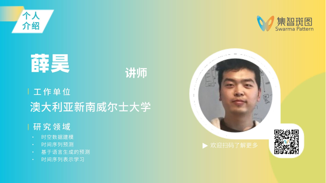 **薛昊,**目前在澳大利亚新南威尔士大学(UNSW Sydney)计算机科学与工程学院担任讲师职位。他于2020年从西澳大利亚大学获得博士学位。在完成博士学位后,曾在RMIT大学计算技术学院和UNSW Sydney工作过。目前是澳大利亚国家科研委员会(ARC)卓越决策与社会自动化中心(ADM+S)UNSW分支的副研究员。研究兴趣包括时空数据建模、时间序列预测、基于语言生成的预测以及时间序列表示学习。