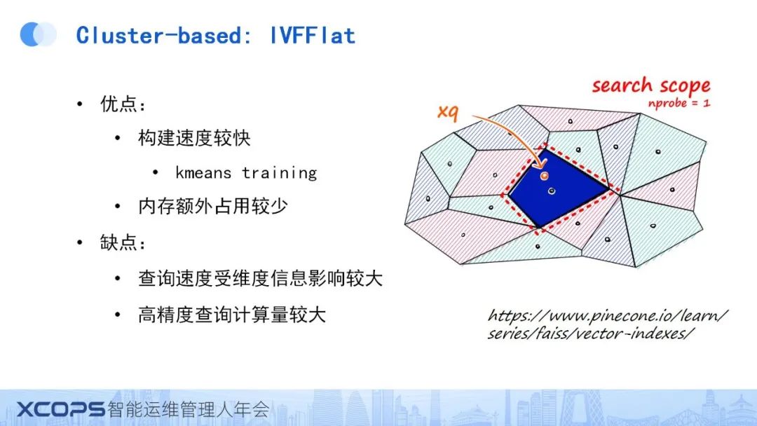 以Faiss库中的ivfflat算法为例,Cluster-based方法的核心思想在于首先对所有待查询向量执行聚类算法,通常利用kmeans算法计算出n个中心点。随后,数据根据这些中心点进行聚类。在搜索过程中,算法首先从这n个中心点中筛选出与查询向量最为接近的k个中心点,然后仅在这些选定的k个中心点所代表的聚类中搜索具体的向量,从而实现了一种有效的剪枝策略。