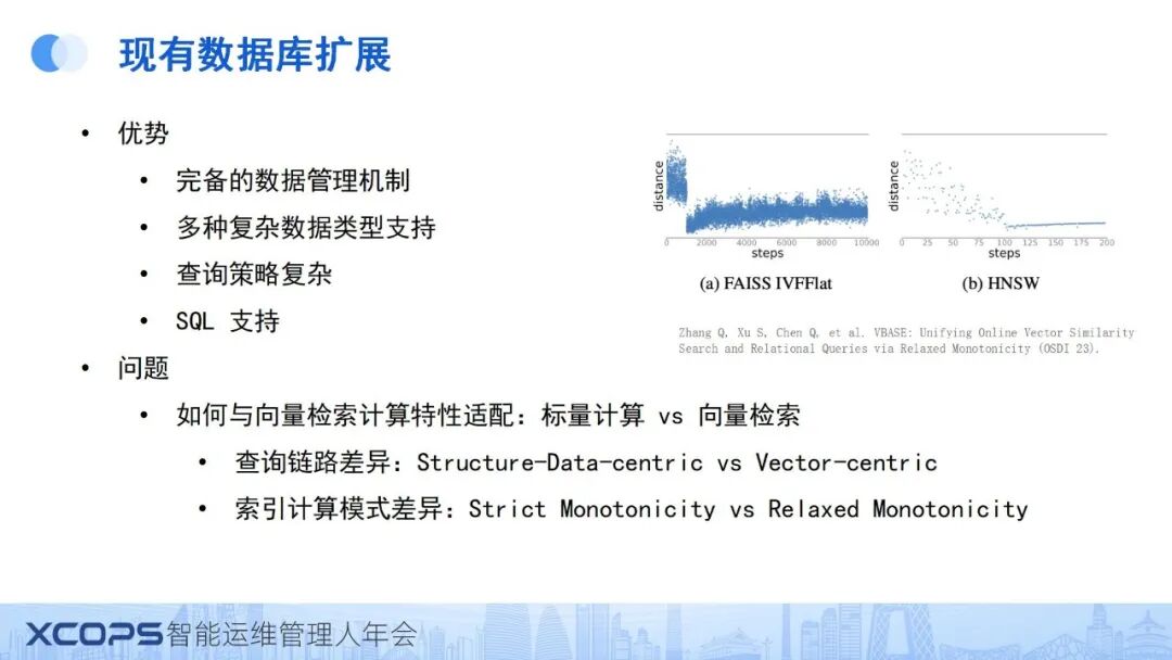 然而,向量检索的计算特性与现有数据库系统之间存在一定的适配问题。数据库系统作为结构数据为中心(structure-data-centric)的设计,其查询路径主要围绕结构数据的特性构建,而向量检索则是以向量为中心(vector-centric)的,两者在查询链路和索引计算模式上存在显著差异。具体而言,传统数据库的索引通常具有强单调性,能够基于索引准确找到目标数据;而向量索引则可能展现出较松散的单调性(如RS单调性),即初次查询可能无法直接定位到最邻近的向量,需经过多轮计算才能逼近。