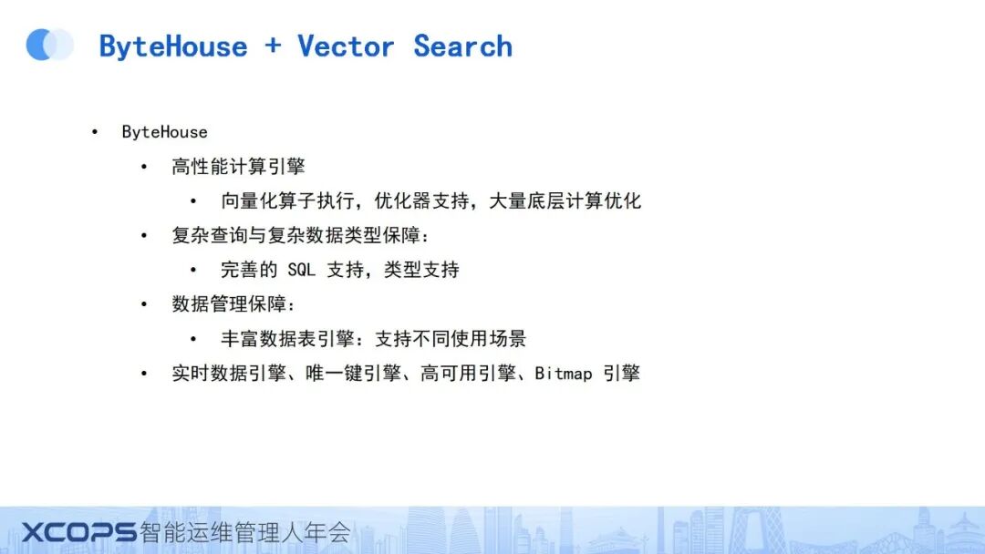 我们在ByteHouse系统中实现了高性能向量检索功能。与ClickHouse相比,ByteHouse在高性能计算方面进行了更为深入的优化,包括但不限于优化器的增强、底层计算能力的提升、复杂查询与数据类型的广泛支持、数据管理的精细化以及表引擎的多样化(如唯一键引擎、高可用引擎和BitEngine引擎等)。