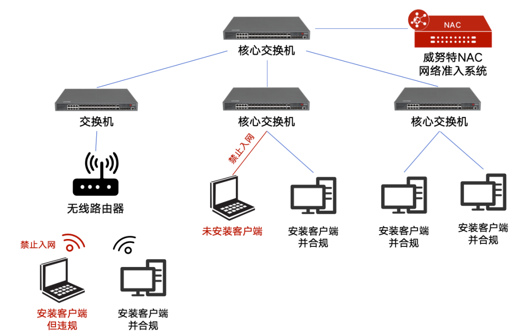 威努特NAC系列网络准入系统,以其“无需改变网络、终端部署灵活”的独特优势,作为一个高效的网络准入平台,能够与用户现有的交换机、杀毒软件、AD域、LDAP服务器等资产无缝集成。通过实施“入网-在网-出网”的整体化流程管理,该系统确保了“违规不入网、入网必合规”的严格规范,从而成为内网安全防护的得力助手。