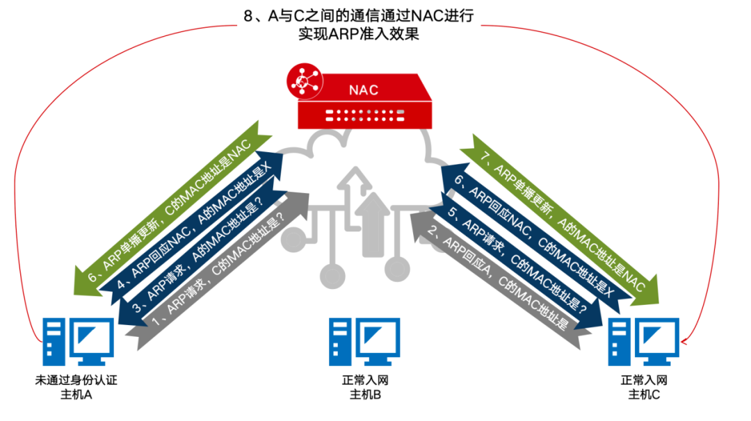 ARP准入控制技术利用了ARP协议的工作机制,通过对ARP请求和响应过程的干预,实现对网络接入设备的认证和授权。其基本流程如下: