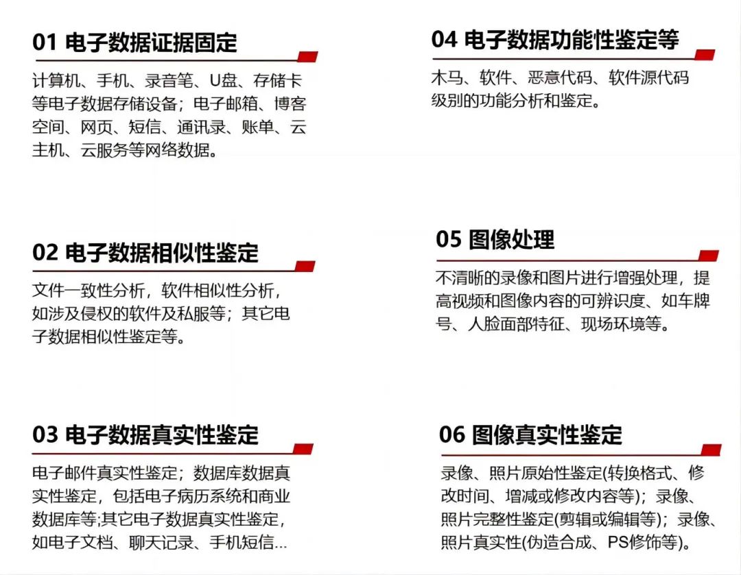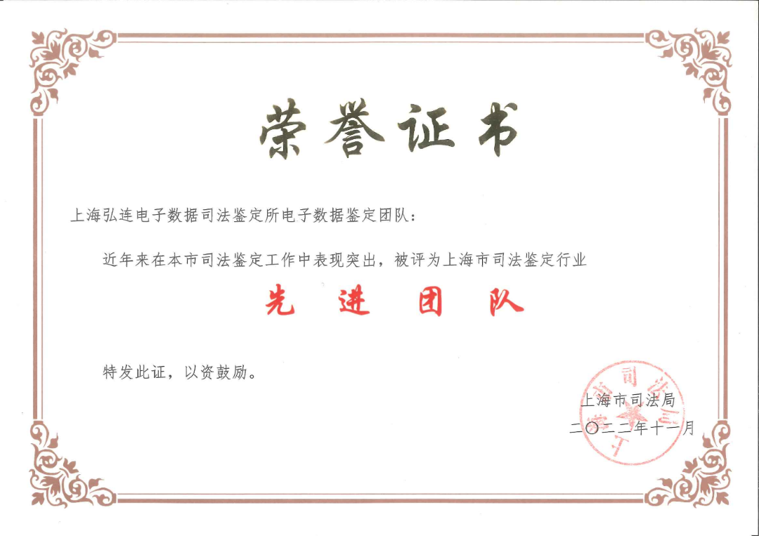 上海弘连电子数据司法鉴定所,同时拥有CMA资质认定和CNAS实验室认可,受理案件量稳居行业前列。2016年至2023年,司鉴所连续八年获得司法部能力验证“满意”结果。2020年荣获“全国公共法律服务工作先进集体”和第三届“宋慈杯”优秀司法鉴定文书一等奖(电子数据取证领域首个一等奖获得者)。2022年荣获上海市司法局颁发的上海市司法鉴定行业“先进团队”荣誉称号(唯一一个民营企业机构)。