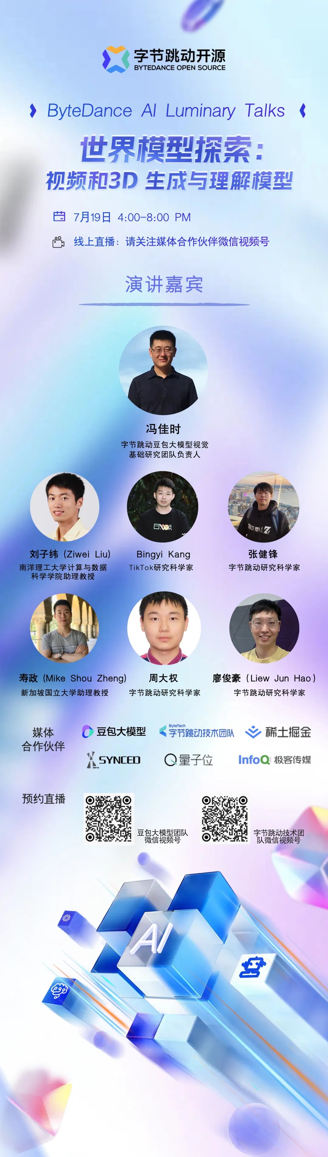 欢迎加入字节跳动 7 月 19 日举办的 AI 技术菁英论坛(ByteDance AI Luminary Talks),共同探讨“世界模型探索:视频和 3D 生成与理解模型”的相关话题和最新的技术进展。本次活动将配有中文同声传译,并将在豆包大模型团队、机器之心、量子位、字节跳动技术团队、稀土掘金和 InfoQ 的微信视频号上同步直播,欢迎扫描图中二维码预约,周五下午 4:00-8:30 我们不见不散!