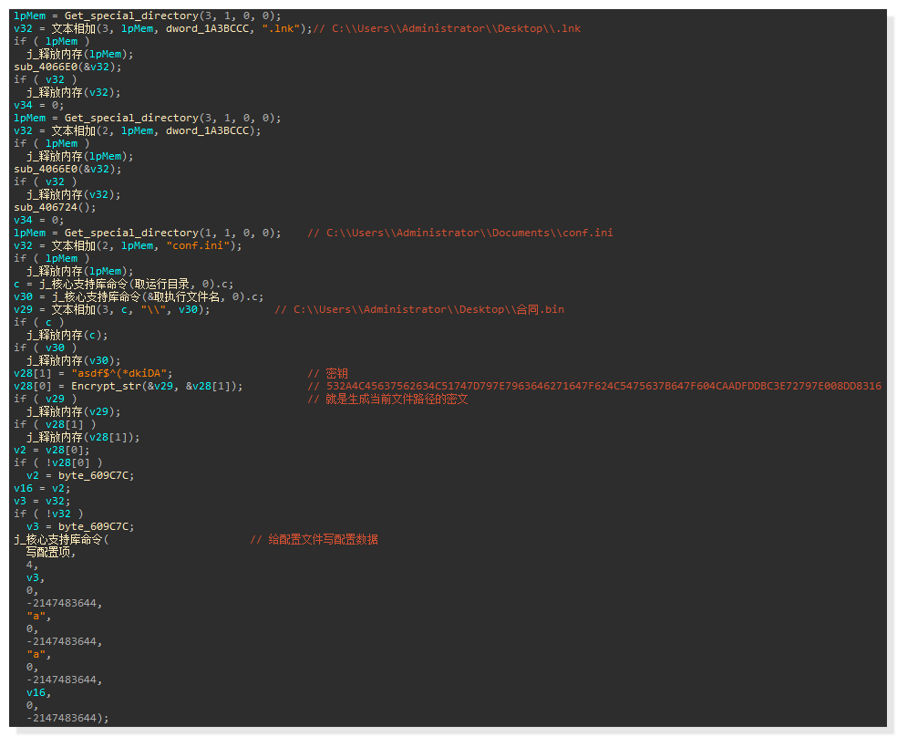 释放的下一阶段 payload 文件有两个。首先释放的是 conf.ini 文件,该文件中会写入由当前执行文件路径转换而成的密文: