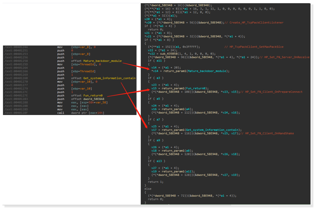 另外,除了前面提到的设立 3 个主要线程外,在操作 HP-Socket 库时, "tomcat.exe" 还会传入函数和是否启动的 flag 标志位,然后根据逻辑条件将 flag 标志位作为 HP-Socket 的回调函数进行执行: