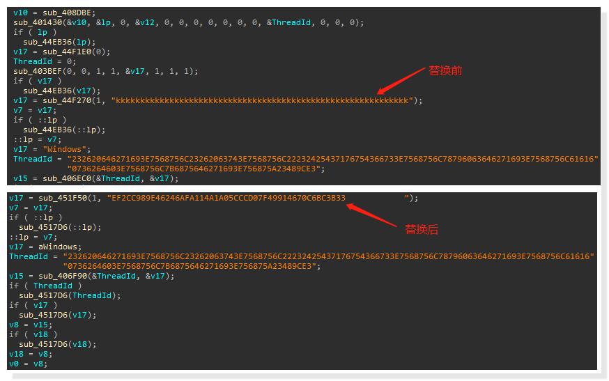 接着解密出另一个可执行文件 "tomcat.exe",第一次解密得到的字节码还要通过内存遍历,用指定的密文替换 tomcat.exe 中作为占位符的 "kkk" 字符串:(根据后面的分析可知,该指定密文为要连接的 C2 IP)
