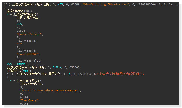 但当杀软数量不止一个时,“合同.exe” 程序则会进一步执行驱动对抗操作。该程序首先会获取本地网络适配器信息以禁用无线网卡:
