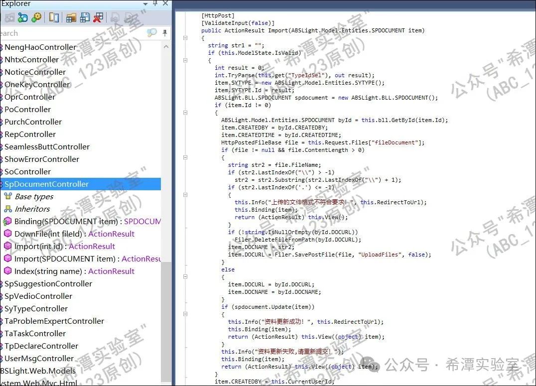 可选择的.NET反编译工具主要有四个:dnSpy(于2020年左右停止更新)、ILSpy、dotPeek(JetBrains发布)、dnSpyx(非官方更新版)。选择一个自己用的顺手的反编译工具对*.Web.dll文件进行反编译,并导出所有反编译后的代码。我也将反编译结果对比了一下,以下是dnSpyx的反编译结果: