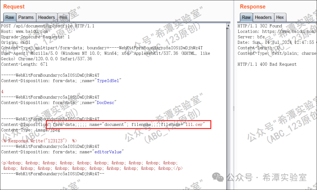 构造上传数据包如下,最终通过**; filename;;;;** 的方式结合**.cer**扩展名绕过了WAF。