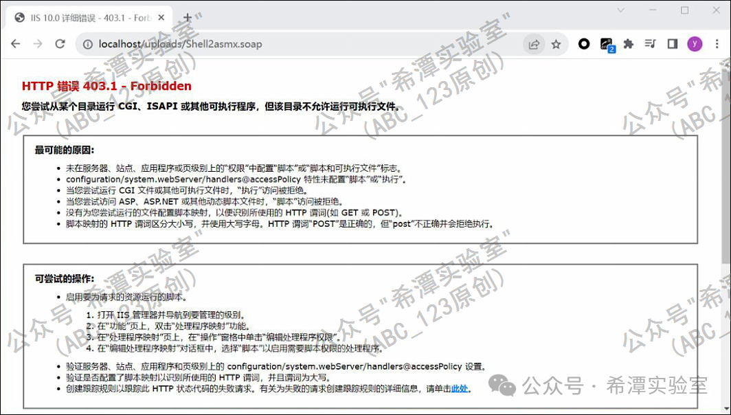 等到第二天起来的时候,访问webshell发现提示“HTTP 错误403.1 - Forbidden”,该目录不允许运行可执行文件,也就意味着webshell在当前目录无法执行。经过判断,猜测蓝队防守方做了加固,在webshell所在文件夹下放置了web.config文件,更改了默认配置,使脚本在当前目录下不能执行。