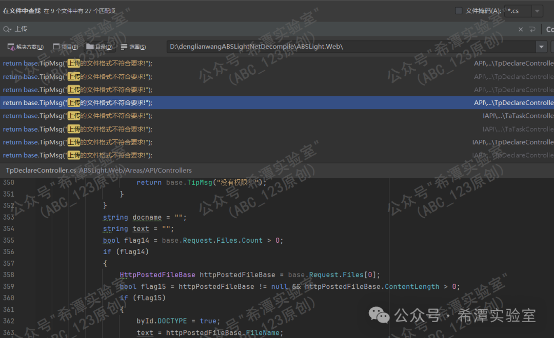 将反编译的代码导入Rider64(IntelliJ IDEA公司出品的),使用IDE进行代码审计、搜索关键字更方便一些。全局搜索”上传”关键字,挨个查看有可能实现了上传功能的.Net类。