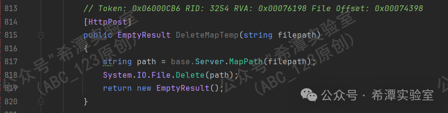 接下来想了解决办法,我们可以找一处任意文件删除漏洞,将web.config文件删掉,从而使web.config文件失去作用,使Webshell可以继续执行。搜索delete关键字挨个查看,找到了一处任意文件删除漏洞,关键代码是System.IO.File.Delete(path),[HttpPost]提示该请求只支持POST形式: