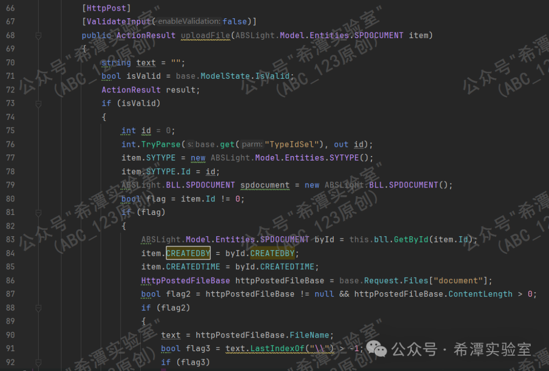 最终发现了如下代码,有可能存在上传漏洞,**[HttpPost]**提示该请求只支持POST请求形式:
