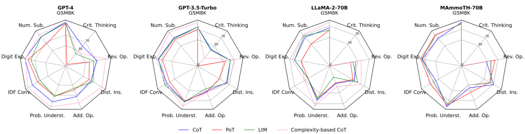 下图展示了在 GSM8K 问题和基于 “运算逆转” 的 GSM-Plus 改写问题上,不同提示技术下 GPT-3.5-Turbo 的表现。虽然所有提示都可以激发 Turbo 准确回答 GSM8K 问题,但只有 Comp 能够帮助 Turbo 在 GSM-Plus 变体问题上生成正确的答案。