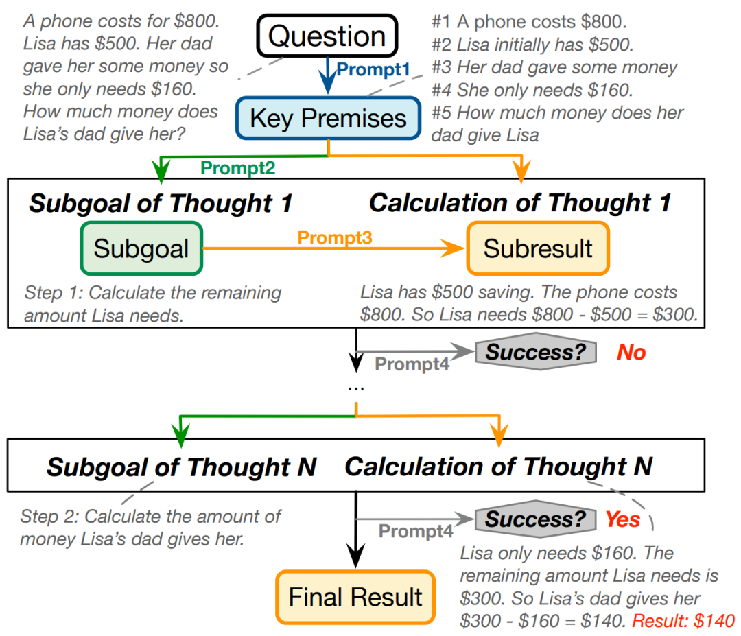 先前的提示技术(例如,CoT,PoT,LtM 和 Complexity-based CoT)对于鲁棒性增强作用不显著,特别是对于 “算术变化 “和” 批判性思维”。在前人工作的基础上,本文进一步探索了一种组合提示方法,通过迭代生成和验证每个推理思维,可以同时提升 LLMs 在 GSM8K 和 GSM-Plus 上的性能。