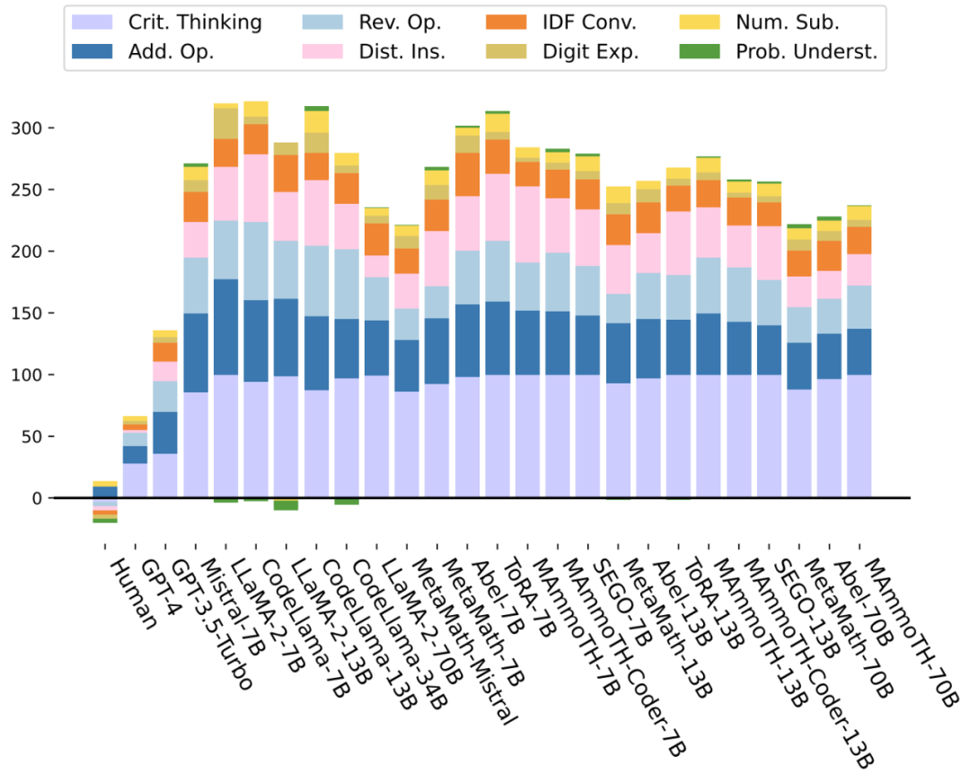 本文进一步评估了 LLMs 在 8 种问题变体下的性能稳定性。与人类基线相比,对于 “批判性思维”(紫色)、“运算扩充” 和 “运算逆转”(蓝色)、“干扰项插入”(粉色)以及 “整数 - 小数 - 分数转换”(橙色)扰动,LLMs 性能下降明显。而对于 “数值替换” 和 “问题理解”,LLMs 的性能稳定,甚至有轻微的提升。
