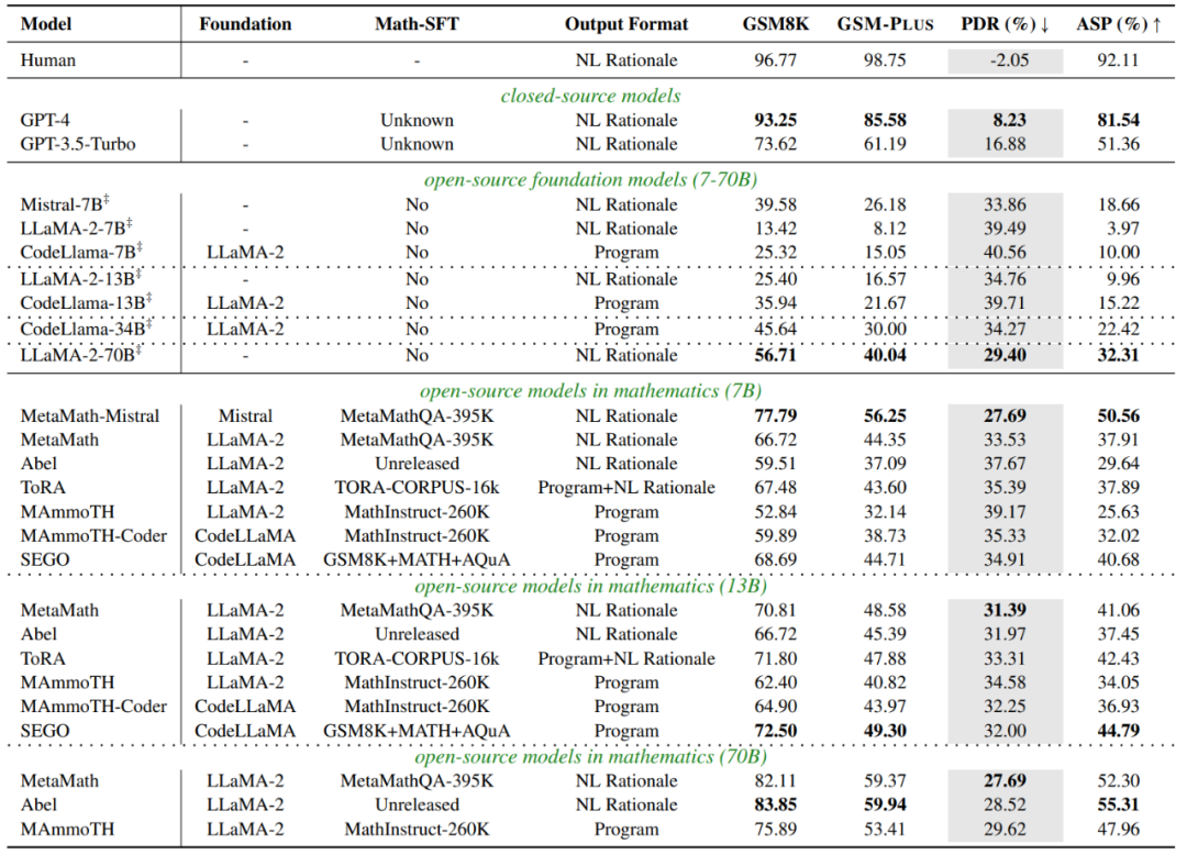 如下表所示,相较于 GSM8K,大多数 LLMs 在 GSM-Plus 上的性能都大幅下降。