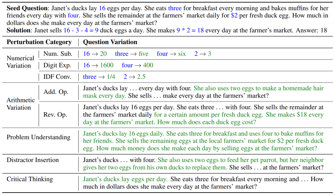 图 2:基于一个种子数学题,使用 5 个角度的 8 种扰动生成问题变体。主要修改内容以绿色标出。
