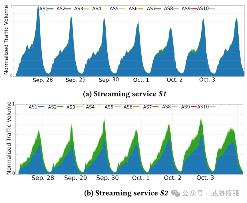流媒体服务 S1 的流量主要来自一个自治系统,流媒体服务 S2 的流量主要来自两个自治系统。