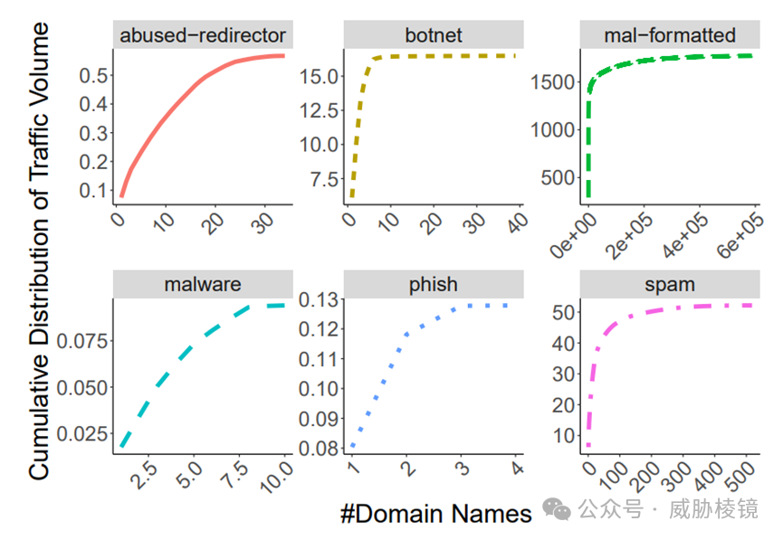 每小时的一百万个域名中,有 612 个域名被 Spamhaus DBL 认为是可疑域名。这些域名产生了数 TB 的流量,大量的流量来自垃圾邮件与僵尸网络,极少的域名就产生的很大的流量。