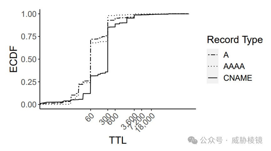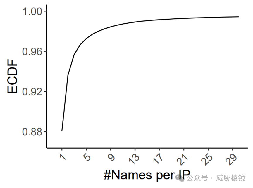这样的关联方式,如果不同域名拥有相同的 IP 的话,所有流量都会关联到第二个域名。统计数据发现 70% 的 DNS 记录的 TTL 小于三百秒: