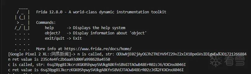 从 c(String str) 函数中可以看出,和我们的初步猜测是一样的,str 为 String.valueOf(hashCode()) 也就是当前对象的哈希码(HashCode)的字符串形式,使用 frida 进行 hook: