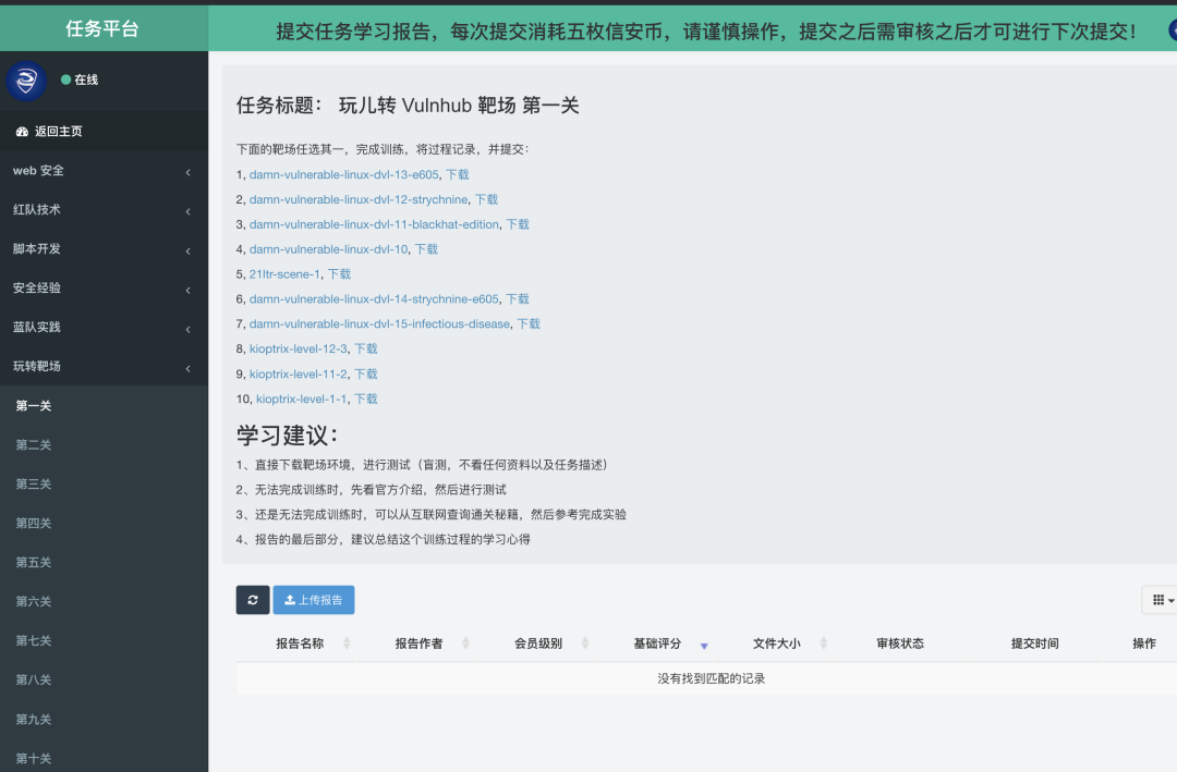 早期,信安之路的成长平台,只有 web 安全、红对技术、蓝队实践、安全经验、脚本开发五个系列,今天上了一个玩转靶场系列,将 Vulnhub 公开的 700 个靶场,分成 70 个任务,每个任务十个靶场,任选其一完成报告即可过关。