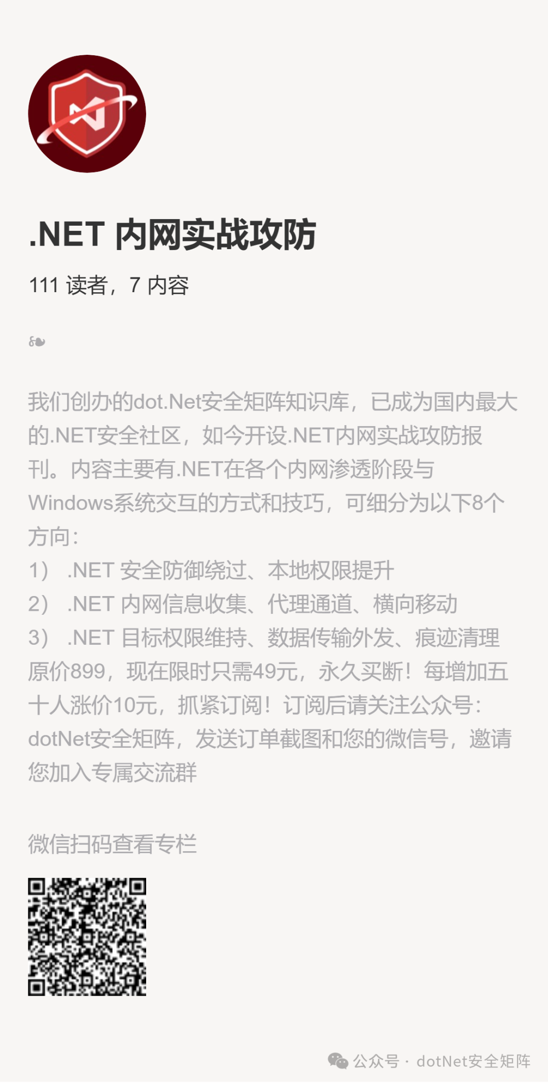 原价899,现在限时只需49元,永久买断!目前已有110+位朋友抢先预定,我们会长期更新,初步计划保持每周更新1-2篇新内容,对.NET内网安全感兴趣的朋友们请尽快订阅该报刊!