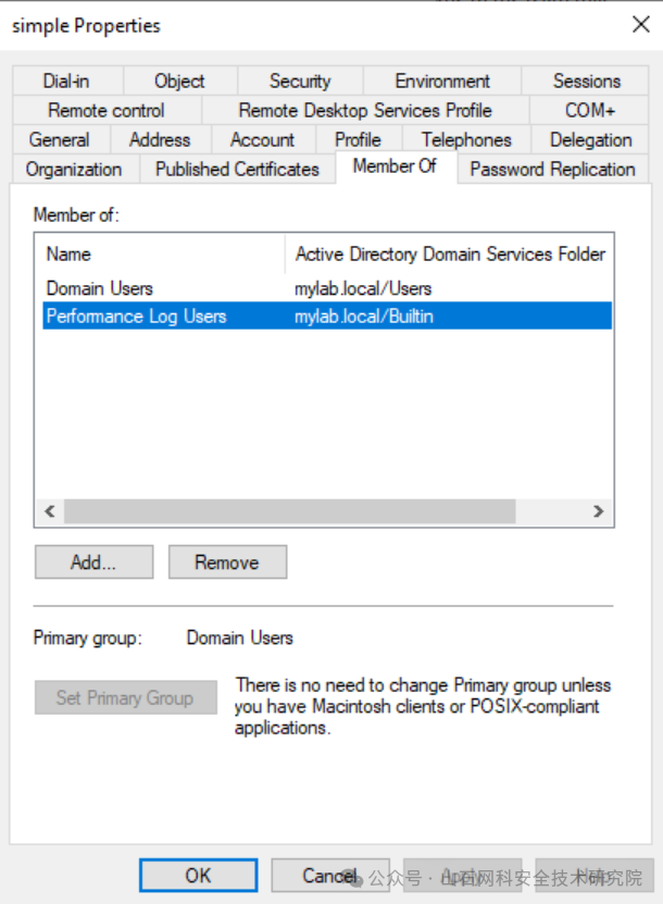 为了测试,我冒充了我的用户“simple”,他是一个普通的域用户,也是“Performance Log Users”域组的成员: